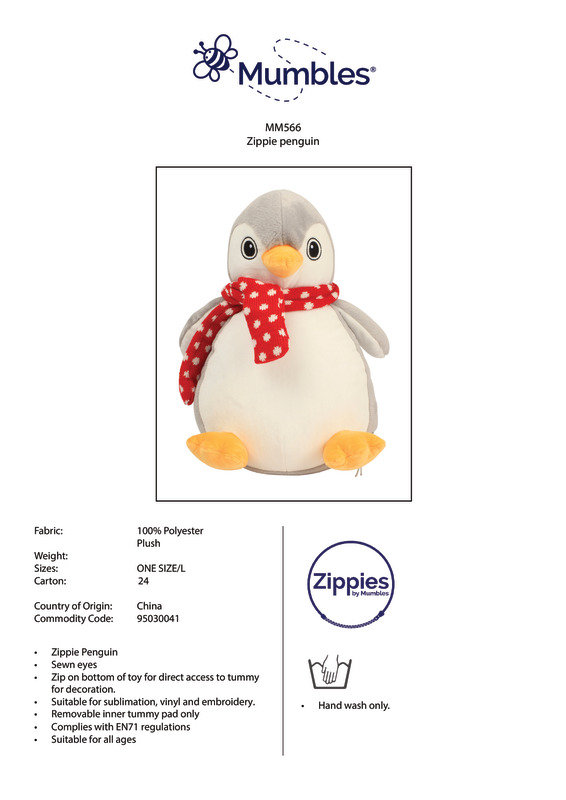 Flying in for warm winter cuddles, the plump penguin has a bright orange beak and feet. Adding character is a woolly scarf with ditsy white spots tied around the neck. A zip around the toy base gives access to embroider the snowy white tummy. Soft plush grey and white penguin with contrast knitted scarfSewn eyesContrast feet and beakWhite coloured panel on tummy perfect for decorationZip access on base for direct access onto the tummy for embroidery or printRemovable inner stuffingCan be embroidered, printed and sublimation printedComplies with EN71 European Toy Safety regulationsRemove all hang tags and their fasteners before giving these items to a childSuitable for all agesBSCI certifiedSEDEX certified.Accreditations: Amfori BSCI|SedexAge Group: Infant|KidsFabric: 100% Polyester plushGender: UnisexPlus Size: NoPrint Area: 23.5 x 22cmProduct Type: Soft ToysSize Range: OnesizeSizing To Fit: One size (38cm)Tag: TaglessWashing Instructions: Hand wash]]>