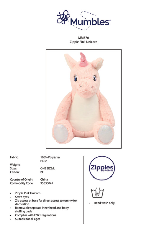 Standing tall with a shimmery pink horn, the fluffy pink mythical creature has contrast shinny paws and a furry tail. A wide tummy area gives plenty space to decorate whimsical statements and names, using the zip around the base of the toy. Soft plush unicorn zippieContrast feet and hornSewn eyesContrast mane and tailWhite panel on tummy perfect for decorationZip access on base for direct access onto the tummy for decorationRemovable inner stuffingCan be embroidered, printed and sublimation printedComplies with EN71 European toy safety regulationsRemove all hang tags and their fasteners before giving these items to a childSuitable for all agesBSCI certifiedSEDEX certified.Accreditations: Amfori BSCI|SedexAge Group: Infant|KidsFabric: 100% Polyester plushGender: UnisexPlus Size: NoPrint Area: 15 x 20cmProduct Type: Soft ToysSize Range: OnesizeSizing To Fit: One size (38cm)Tag: TaglessWashing Instructions: Hand wash]]>