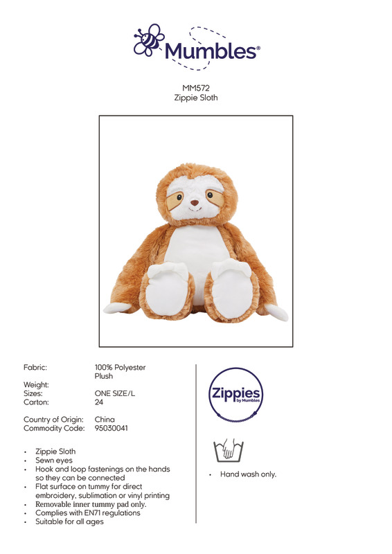 The slow mover. Hang out with the Mumbles Zippie Sloth, with hook and loop fastening on the paws as well as cute contrast face, hands and feet. Perfect for decorating, the tummy is made in a flatter pile for easy embroidery or print.Soft plush Zippie Sloth with contrast face, hands and feetSewn eyes and mouthHook and loop fastening on handsWhite panel on tummy, perfect for decorationZip access on base for direct access onto the tummy for decorationRemovable inner stuffingCan be embroidered, vinyl and sublimation printedComplies with EN71 European Toy Safety regulationsRemove all hang tags and their fasteners before giving these items to a childSuitable for all agesSEDEX certifiedBSCI certified.Accreditations: Amfori BSCI|SedexFabric: 100% PolyesterGender: UnisexPlus Size: NoProduct Type: Soft ToysSize Range: LSizing To Fit: L (42cm)Tag: Sewn TagWashing Instructions: Hand wash]]>