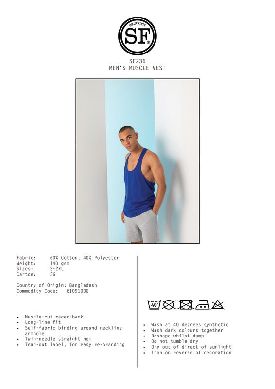 Look cool while warming up in this muscle cut racerback in an on-trend longline fit style. Self-fabric binding around neckline and armholes. Tear-out label for easy rebranding. A great fashion staple and ideal for a body and mind customer.Tear-out SF (Skinnifit) labelMuscle-cut racer-backLong-lineSelf-fabric binding around neckline and armholeTwin needle straight hemSEDEX certifiedOeko-Tex certifiedBSCI certifiedVegan certified.Accreditations: Amfori BSCI|Oeko-Tex|Sedex|Peta Approved VeganAge Group: AdultFabric: 60% Cotton, 40% Polyester single Jersey. Heather Grey: 85% Cotton, 15% ViscoseGender: MalePlus Size: NoProduct Type: VestsSize Range: S to 2XLSizing To Fit: S 36/38″ M 38/40″ L 42″ XL 44/46″ 2XL 48″Tag: Tear-outWashing Instructions: Wash at 40 degrees. Wash as synthetics. Do not bleach. Do not tumble dry. Do not dry clean. Wash dark colours together. Re-shape whilst damp. Dry out of direct heat and sunlight. Iron at medium temperature on reverse.Weight (GSM): 140gsm]]>