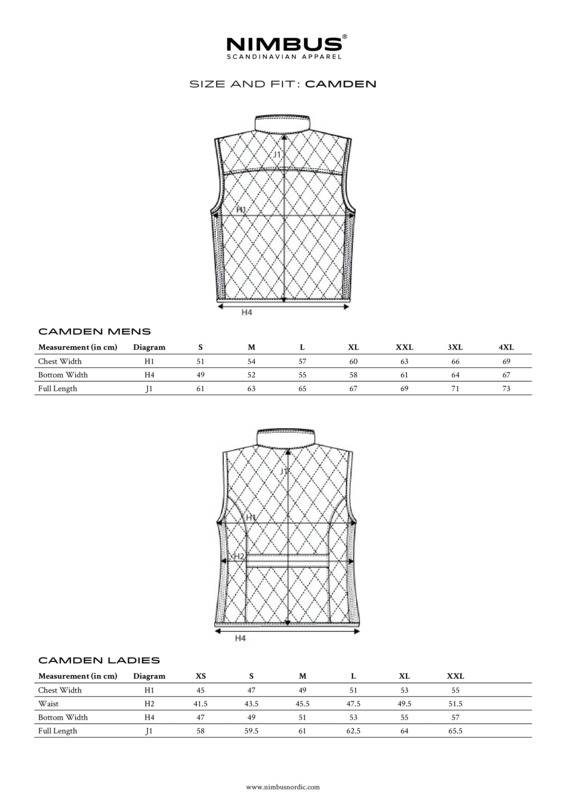 The Camden is the ultimate layering piece – a light, padded and quilted gilet inspired by country living, adding a touch of urban tranquillity and a dash of business perfection. It features elegant details such as a medium high neck collar with comfortable knit, inner pocket, metal zip and two utility pockets. Nimbus’s fashionable leather details add to the authentic quilted look. An insulated garment for those who want to commute light or who prefer a little extra warmth underneath a jacket.DETAILS: Diamond quiltHerringbone tape at sleeves and bottomTwo front pockets with pocket flap and button closureWater-repellent finish (Bionic Finish® ECO)SUSTAINABILITY: ReachGlobal CompactAmforiWater-repellent - Bionic Finish® ECOAccreditations: Amfori BSCIAge Group: AdultFabric: Outer fabric: 100% Nylon, diamond quilted. Water-repellent finish - Bionic Finish® ECO. Lining: 100% Polyester. Padding: 100% PolyesterGender: FemalePlus Size: YesProduct Type: Gilets & Body WarmersSize Range: XS to XLSizing To Fit: XS 8 S 10 M 12 L 14 XL 16 2XL 18 3XL 20Tag: Sewn TagWeight (GSM): Shell: 60gsm. Lining: 60/65gsm]]>
