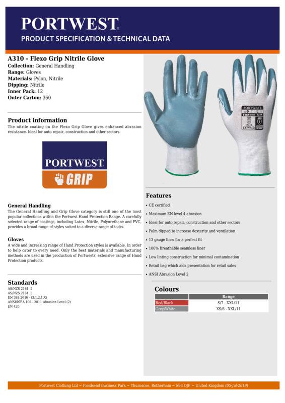 The nitrile coating on the Flexo Grip Glove gives enhanced abrasion resistance. Ideal for auto repair construction and other sectors.Conform to EN388:2016 (3.1.2.1.X) and EN420Seamless 13 gauge nylon liner with nitrile coating on palm and fingersSmooth finishEnhanced abrasion resistanceOpen back for extra ventilationKnitted wristExcellent dexterity, ideal for handling of abrasive materialsPrevents grease, oil and water penetrationApplications: utilities, maintenance, refuse collection, warehousingReach certifiedSEDEX certified.Accreditations: Sedex|ReachAge Group: AdultFabric: Nylon, NitrileGender: UnisexPlus Size: NoProduct Type: GlovesSize Range: M to XLSizing To Fit: M 8 L 9 XL 10Tag: Tagless]]>