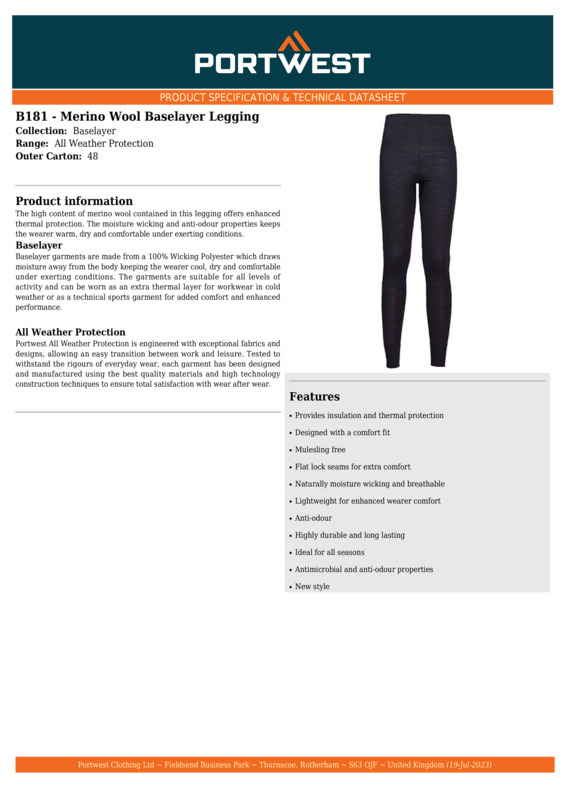 The high content of merino wool contained in this legging offers enhanced thermal protection. The moisture wicking and anti-odour properties keeps the wearer warm, dry and comfortable under exerting conditions.Provides insulation and thermal protectionDesigned with a comfort fitMulesing-freeFlat lock seams for extra comfortNaturally moisture wicking and breathableLightweight for enhanced wearer comfortAnti-odourHighly durable and long lastingIdeal for all seasonsAntimicrobial and anti-odour propertiesRetail box which aids presentation for retail salesOeko-Tex, WRAP GOLD, Eco Vadis and Sedex certified.Accreditations: Oeko-Tex|WRAP|SedexAge Group: AdultFabric: Shell fabric: 50% Merino wool, 50% PolyesterGender: MalePlus Size: NoProduct Type: BaselayersSize Range: S to 2XLSizing To Fit: S 30/32″ M 33/34″ L 36/38″ XL 40/41″ 2XL 42/44″Tag: Tear-outWashing Instructions: Wash at or below 30 degrees. Do not bleach. Do not tumble dry. Drip dry. Do not iron. Do not dry clean.Weight (GSM): 140g]]>