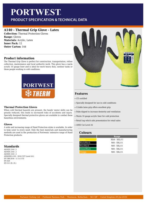 The Thermal Grip Glove is perfect for construction transportation refuse collection maintenance and local authority work. This glove has a warm acrylic 10 gauge liner and is ideal for more heavy duty outdoor tasks or those people working in cold conditions.Conform to EN388:2016 (1.1.4.1.X)EN420 and EN511 (X.1.X)Seamless 10 gauge premium quality grip glove for cold conditionsBlack latex crinkle finish on warm acrylic liner with elasticated knitwrist for secure fitIdeal for outdoor heavy duty tasksApplications: construction, transportation, refuse collection, maintenance, local authorityReach certifiedSEDEX certified.Accreditations: Sedex|ReachAge Group: AdultFabric: Acrylic, latexGender: UnisexPlus Size: NoProduct Type: GlovesSize Range: M to 2XLSizing To Fit: M 8 L 9 XL 10 2XL 11Tag: Tagless]]>