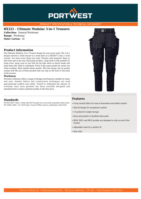 The Ultimate modular 3-in-1 trouser design for your every need. The 3-in-1 design converts a work trouser to a work short or a EN20471 Class 1 work trouser. You have every thing you need. Pockets with magnetic flaps so they don't get in the way, kneepads pockets, large built-in side pockets for large tools, spray cans or just fold up the legs when in shorts mode and keep them safe. Built-in waistband, front of leg cargo pocket for easier use when working, with a mesh mobile phone pocket. Plus the unique clip on pocket system with the use of three pockets that can clip on the front or the back of the trouser.4-way stretch fabric for ease of movement and added comfortSlim fit design for exceptional comfort15 pockets for ample storageKneepad pockets to facilitate kneepadsAdjustable waist for a perfect fitOeko-Tex, WRAP GOLD, Eco Vadis and Sedex certified.Accreditations: Oeko-Tex|WRAP|SedexAge Group: AdultFabric: Shell fabric: 52% Recycled nylon, 40% Nylon, 8% Elastane. Contrast fabric: CorePro: 87% Nylon, 13% ElastaneGender: MaleLeg Length: Leg length: Regular 31″Plus Size: YesProduct Type: TrousersSize Range: 28 to 42Sizing To Fit: 28″ 30″ 32″ 34″ 36″ 38″ 40″ 42″Tag: Sewn TagWashing Instructions: Wash at or below 30 degrees. Do not bleach. Do not tumble dry. Drip dry. Do not iron. Do not dry clean.Weight (GSM): 230g]]>