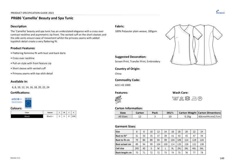 The 'Camellia' beauty and spa tunic has an understated elegance with a cross over contrast neckline and asymmetric zip front. The vented cuff on the short sleeves and the side vents ensure ease of movement whilst the princess seams with added topstitch detail create a very flattering fit.Beauty and spa tunic with cross over neckline and asymmetric zip frontShort sleeve with vented cuffSide ventsPrincess seams with topstitch detail for flattering fitEasycareBSCI certifiedReach certified.Accreditations: Amfori BSCI|ReachAge Group: AdultFabric: 100% Polyester plain weaveGender: FemalePlus Size: YesProduct Type: TunicsSize Range: 6 to 24Sizing To Fit: 6 XXS 8 XS 10 S 12 M 14 L 16 XL 18 2XL 20 3XL 22 4XL 24 5XLTag: Sewn TagWashing Instructions: Domestic wash at 40c.Weight (GSM): 185gsm]]>