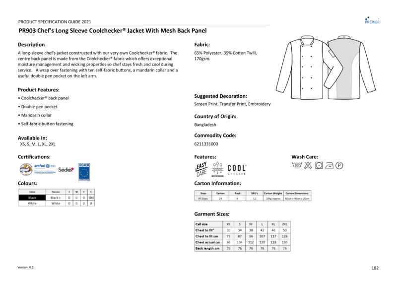 A long sleeve chef's jacket constructed with Coolchecker® fabric. The centre back panel is made from the Coolchecker® fabric which offers exceptional moisture management and wicking properties so chef stays fresh and cool during service. A wrap over fastening with ten self-fabric buttons, a mandarin collar and a useful double pen pocket on the left arm.Coolchecker® mesh back panelWrap over fastening with ten self-fabric buttonsMandarin collarLeft sleeve double pen pocketWRAP certifiedReach certifiedBSCI certifiedSEDEX certified.Accreditations: Amfori BSCI|Oeko-Tex|Sedex|WRAP|ReachAge Group: AdultFabric: 65% Polyester, 35% CottonGender: MalePlus Size: NoProduct Type: Chef JacketsSize Range: XS to 2XLSizing To Fit: XS 30″ S 34″ M 38″ L 42″ XL 46″ 2XL 50″Tag: Sewn TagWashing Instructions: 60C domestic wash, industrial wash 85CWeight (GSM): 170gsm]]>
