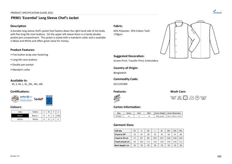A durable long sleeve chef's jacket that fastens down the right hand side of the body with five long life resin buttons. On the upper left sleeve there is a handy double pocket pen compartment. This jacket is styled with a mandarin collar and is available in Black and White and offers great value for money.Right hand wrap fastening with five long life resin buttonsLeft sleeve double pan pocketMandarin collarWRAP certifiedReach certifiedBSCI certifiedSEDEX certified.Accreditations: Amfori BSCI|Oeko-Tex|Sedex|WRAP|ReachAge Group: AdultFabric: 65% Polyester, 35% CottonGender: MalePlus Size: YesProduct Type: Chef JacketsSize Range: XS to 4XLSizing To Fit: XS 30″ S 34″ M 38″ L 42″ XL 46″ 2XL 50″ 3XL 54″ 4XL 58″Tag: Sewn TagWashing Instructions: 60C domestic wash, industrial wash 85CWeight (GSM): 170gsm]]>