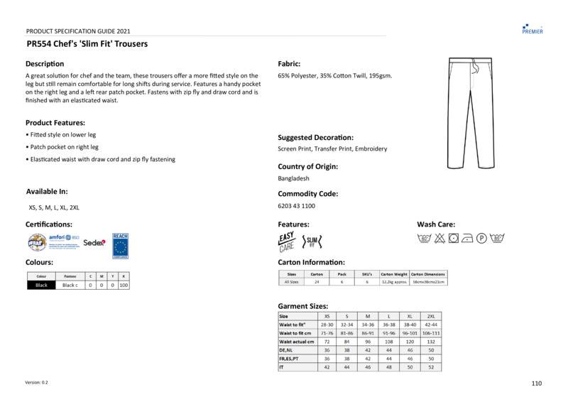 A great solution for chef and the team, these trousers offer a more fitted style on the leg but still remain comfortable for long shifts during service. Features a handy pocket on the right leg and a left rear patch pocket. Fastens with zip fly and draw cord and is finished with an elasticated waist.Fitted style on lower legPocket on the right leg and a rear patch pocketElasticated waistZip fly and drawcord fasteningWRAP certifiedOeko-Tex certifiedBSCI certifiedReach certifiedSEDEX certified.Accreditations: Amfori BSCI|Oeko-Tex|Sedex|WRAP|ReachAge Group: AdultFabric: 65% Polyester, 35% CottonGender: UnisexPlus Size: NoProduct Type: TrousersSize Range: XS to 2XLSizing To Fit: XS 28/30″ S 32/34″ M 34/36″ L 36/38″ XL 38/40″ 2XL 42/44″Tag: Sewn TagWashing Instructions: Domestic wash 60°c. Industrial laundry 85°c.Weight (GSM): 195gsm]]>