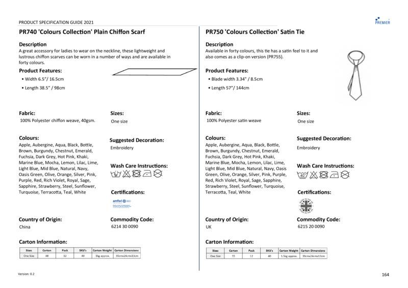 A great accessory for ladies to wear on the neckline, these light and lustrous chiffon scarves can be worn in a number of ways and are available in 38 colours from Premier's Colours Collection'. A charming and feminine piece to help elevate a plain work blouse.A great accessory for ladies to wear on the neckline, these light and lustrous chiffon scarves can be worn in a number of ways and are available in forty coloursBSCI certified.Accreditations: Amfori BSCIAge Group: AdultFabric: 100% Polyester, chiffon weaveGender: FemalePlus Size: NoProduct Type: ScarvesSize Range: OnesizeSizing To Fit: One size - Width: 6.5″/16.5cm, length: 38.5″/98cmTag: Sewn TagWashing Instructions: Hand wash onlyWeight (GSM): 60g]]>