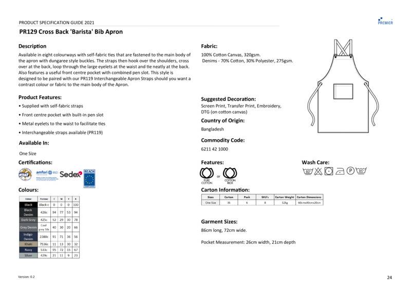 This style is designed to be paired with our PR119 Interchangeable apron straps should you want a contrast colour or fabric to the main body of the apron.Self-fabric ties that are fastened to the main body of the apron with dungaree style bucklesThe straps then hook over the shoulders, cross over at the back, loop through the large eyelets at the waist and tie neatly at the backAlso features a useful front centre pocket with combined pen slotThis style is designed to be paired with our PR119 Interchangeable apron straps should you want a contrast colour or fabric to the main body of the apronWRAP certifiedOeko-Tex certifiedBSCI certifiedReach certifiedSEDEX certified.Accreditations: Amfori BSCI|Oeko-Tex|Sedex|WRAP|ReachAge Group: AdultFabric: 100% Cotton canvas. Denim: 70% Cotton, 30% PolyesterGender: UnisexPlus Size: NoProduct Type: ApronsSize Range: OnesizeSizing To Fit: One size (width 72cm length 86cm)Tag: Sewn TagWashing Instructions: Domestic wash 60°c. Industrial wash 85°c.Weight (GSM): Cotton canvas: 320gsm, Denim: 265gsm]]>