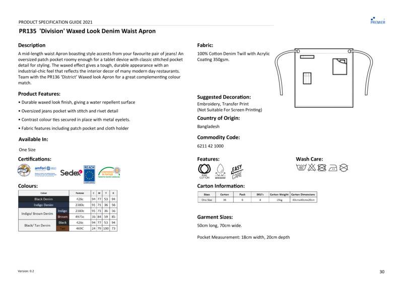 A mid-length waist apron boasting style accents from your favourite pair of jeans! An oversized patch pocket roomy enough for a tablet device with classic stitched pocket detail for styling. The waxed effect gives a tough, durable appearance with an industrial-chic feel that reflects the interior decor of many modern day restaurants.Acrylic coating for a waxed effect giving water repellent propertiesContrast jeans stitching with functional features including patch pocket and cloth holderMeasuring 50cm long and 70cm wideWRAP certifiedOeko-Tex certifiedBSCI certifiedReach certifiedSEDEX certified.Accreditations: Amfori BSCI|Oeko-Tex|Sedex|WRAP|ReachAge Group: AdultFabric: 100% Cotton denim with acrylic coatingGender: UnisexPlus Size: NoProduct Type: ApronsSize Range: OnesizeSizing To Fit: One size (width 70cm length 50cm)Tag: Sewn TagWashing Instructions: Domestic wash at 60°c.Weight (GSM): 350gsm]]>