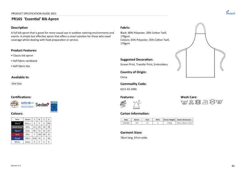 A full bib apron that is great for more casual use in outdoor catering environments and events. A simple but effective apron that offers a smart solution for those who need coverage whilst dealing with food preparation or service.Essential Premier bib apronSelf fabric neck tie and self fabric ties 78cm longWRAP certifiedOeko-Tex certifiedBSCI certifiedReach certifiedSEDEX certified.Accreditations: Amfori BSCI|Oeko-Tex|Sedex|WRAP|ReachAge Group: AdultFabric: Black: 80% Polyester, 20% Cotton twill. Colours: 65% Polyester, 35% Cotton twillGender: UnisexPlus Size: NoProduct Type: ApronsSize Range: OnesizeSizing To Fit: One size (width 67cm, length 78cm)Tag: Sewn TagWashing Instructions: Industrial laundering at 85c. Domestic wash at 60cWeight (GSM): 170gsm]]>