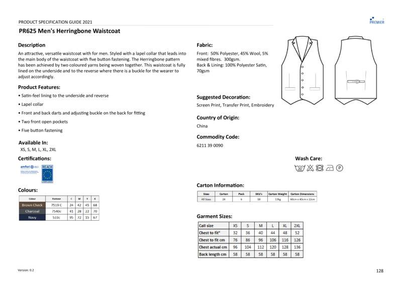 A highly versatile style that provides a solution for front-of-house service teams and smart corporate dressing occasions. Also looks great with a pair of jeans for a look that is reflective of current high street trends.An attractive, versatile waistcoat for menStyled with a lapel collar that leads into the main body of the waistcoat with five button fasteningThe herringbone pattern has been achieved by two coloured yarns being woven togetherThis waistcoat is fully lined on the underside and to the reverse where there is a buckle for the wearer to adjust accordinglyFeatures two front open pocketsBSCI certifiedReach certified.Accreditations: Amfori BSCI|ReachAge Group: AdultFabric: 50% Wool, 45% Polyester, 5% Mixed fibresGender: MalePlus Size: NoProduct Type: WaistcoatsSize Range: XS to 2XLSizing To Fit: XS 32″ S 36″ M 40″ L 44″ XL 46″ 2XL 52″Tag: Sewn TagWashing Instructions: 30°C machine wash.Weight (GSM): 300gsm]]>