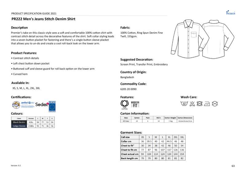 Up your 9-5 game with this smart-casual denim shirt. Premier’s take on this classic style sees a soft and comfortable 100% cotton shirt with contrast stitch detail across the main seams and decorative features of the shirt. Soft collar styling leads into a seven button placket for fastening and there’s a single button sleeve placket that allows you to un-do and create a cool roll-back look on the lower arm.Long sleeve denim shirt with contrast stitch detail with left breast pocketButtoned cuff and sleeve guardCurved hemBack yokeWRAP certifiedBSCI certifiedReach certifiedSEDEX certified.Accreditations: Amfori BSCI|Sedex|WRAP|ReachAge Group: AdultFabric: 100% Cotton, ringspun denimGender: MalePlus Size: YesProduct Type: ShirtsSize Range: XS to 3XLSizing To Fit: XS 30″ S 34″ M 38″ L 42″ XL 46″ 2XL 50″ 3XL 54″Tag: Sewn TagWashing Instructions: Domestic wash 40°c.Weight (GSM): 155gsm]]>