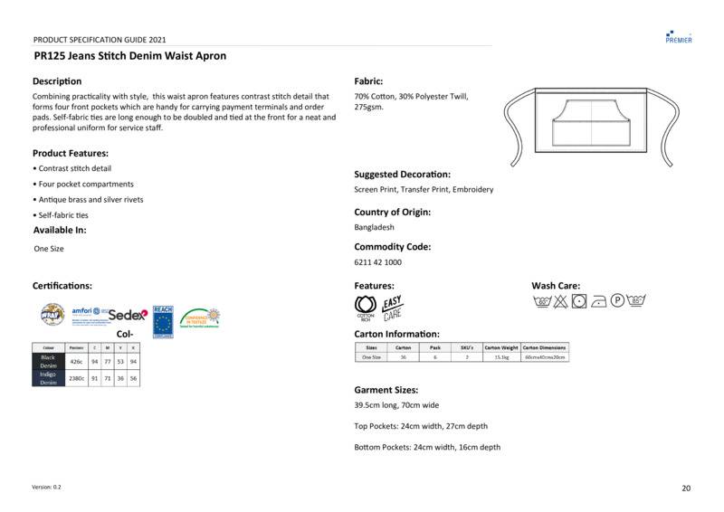 We have combined practicality with style and are proud to present this trendy denim waist apron that is a welcome addition to the hospitality wear collection. A popular cropped style featuring contrast stitch detail that forms four front pockets which are handy for carrying payment terminals and order pads. Self-fabric ties are long enough to be doubled and tied at the front completing a neat and professional uniform for service staff.Denim waist apron with contrast stitchingCopper rivetsFour pocket compartments106cm self fabric tiesLength of apron is 39.5 cm and width 79cmWRAP certifiedOeko-Tex certifiedBSCI certifiedReach certifiedSEDEX certified.Accreditations: Amfori BSCI|Oeko-Tex|Sedex|WRAP|ReachAge Group: AdultFabric: 70% Cotton, 30% PolyesterGender: UnisexPlus Size: NoProduct Type: ApronsSize Range: OnesizeSizing To Fit: One size (width 79cm, length 39.5cm)Tag: Sewn TagWashing Instructions: Domestic wash 60°c. Industrial laundry 85°c.Weight (GSM): 275gsm]]>