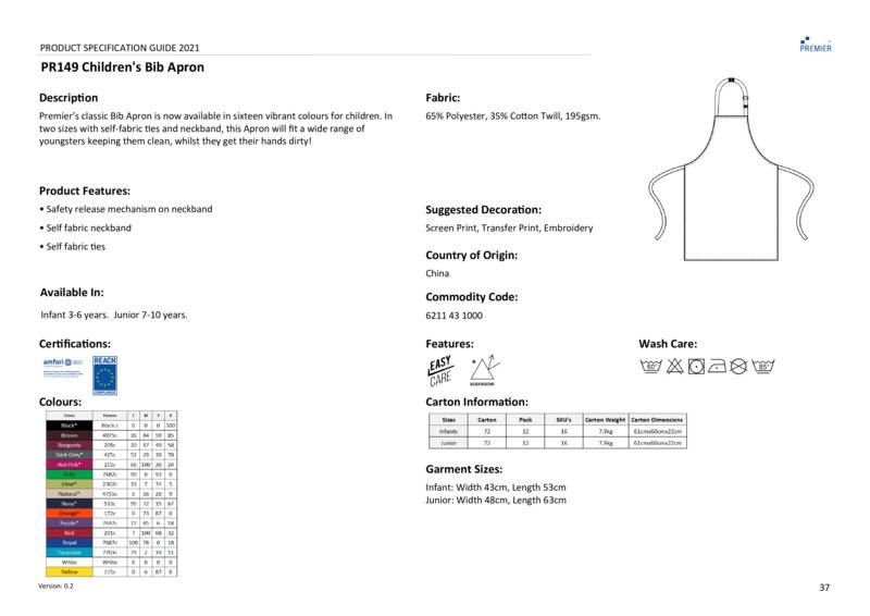 A children's apron which is available in vibrant colours matching the popular 'Colours Collection' from Premier. This bib apron is available in infant and junior sizing and features a snap release buckle on the neckband so if any strain is felt on the neck, the band releases quickly and safely. Perfect for cooking, craft and gardening activities.Classic Premier children's bib apronSelf fabric neckbandSelf fabric ties 50cm longWidth: Infant 43cm, Junior 48cmLength: Infant 53cm, Junior 63cmFeatures a snap safety release buckleBSCI certifiedReach certified.Accreditations: Amfori BSCI|ReachAge Group: Infant|KidsFabric: 65% Polyester, 35% Cotton twillGender: UnisexPlus Size: NoProduct Type: ApronsSize Range: Infants to JuniorsSizing To Fit: Infants 3/6yrs Juniors 7/10yrsTag: Sewn TagWashing Instructions: Industrial laundering at 85c. Domestic wash at 60cWeight (GSM): 195gsm]]>