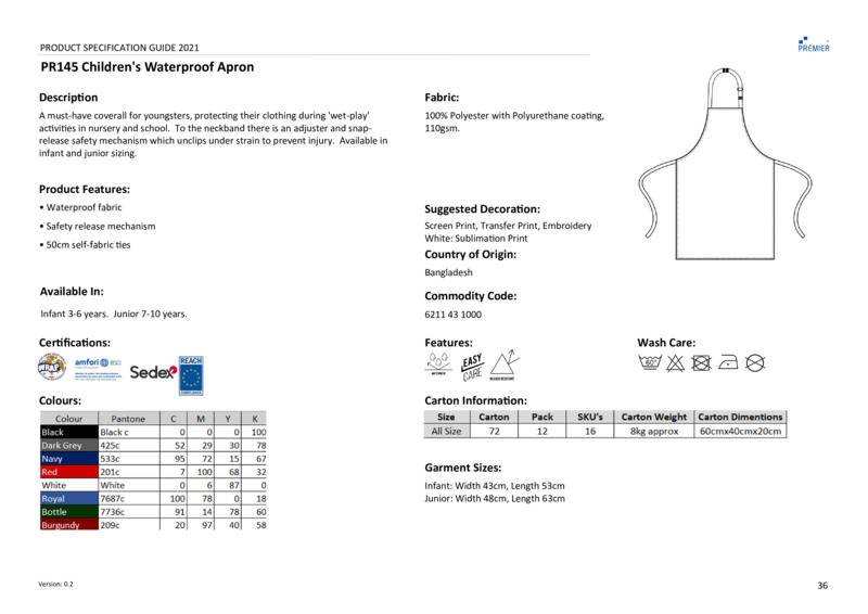 A must-have coverall for youngsters, protecting their clothing during 'wet-play' activities in nursery and school. To the neckband there is an adjuster and snap- release safety mechanism which releases under strain to prevent injury. Available in infant and junior sizing.Waterproof bib apronSelf-fabric neckband and tiesAdjuster and safety release mechanism on the neckbandInfant and Junior sizesWRAP certifiedReach certifiedBSCI certifiedSEDEX certified.Accreditations: Amfori BSCI|Sedex|WRAP|ReachAge Group: KidsFabric: 100% Polyester with polyurethane coatingGender: UnisexPlus Size: NoProduct Type: ApronsSize Range: Infant to JuniorSizing To Fit: Infants 3/6yrs Junior 7/10yrsTag: Sewn TagWashing Instructions: 60C domestic wash, industrial wash 85CWeight (GSM): 110gsm]]>