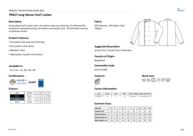 An easycare long sleeve chef's jacket with a ten-button wrap over style fastening. To withstand the demands of repeated washing, the buttons are long-life resin buttons. A smart jacket for chefs with a mandarin collar for a streamlined look. Available in black, white and steel across a wide range of sizes.Ten button hole wrap over fasteningHigh quality, long-life, resin buttonsUnisex sizingWRAP certifiedOeko-Tex certifiedBSCI certifiedReach certifiedSEDEX certified.Accreditations: Amfori BSCI|Oeko-Tex|Sedex|WRAP|ReachAge Group: AdultFabric: 65% Polyester, 35% Cotton twillGender: MalePlus Size: YesProduct Type: Chef JacketsSize Range: XS to 4XLSizing To Fit: XS 30″ S 34″ M 38″ L 42″ XL 46″ 2XL 50″ 3XL 54″ 4XL 58″Tag: Sewn TagWashing Instructions: Industrial laundering at 85c. Domestic wash at 60cWeight (GSM): 195gsm]]>