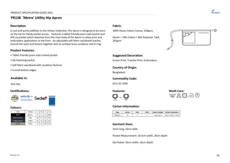 A cool and quirky addition to the Artisan collection, this apron is designed to be worn on the hip for handy pocket access. Features a tablet-friendly jeans style pocket and YKK zip pocket which detaches from the main body of the apron to allow print and embroidery applications to the front. An adjustable self-fabric waistband reaches around the waist and fastens together with an antique brass carabiner and D-ring.Hip apron with adjustable self-fabric waistbandD-ring and carabiner fasteningsJeans style stitched pocketsZipped pocketWRAP certifiedReach certifiedBSCI certifiedSEDEX certified.Accreditations: Amfori BSCI|Sedex|WRAP|ReachAge Group: AdultFabric: 100% Heavy cotton canvas. Denim: 70% Cotton, 30% PolyesterGender: UnisexPlus Size: NoProduct Type: ApronsSize Range: OnesizeSizing To Fit: One size (31cm long, 32cm wide)Tag: Sewn TagWashing Instructions: 60C domestic wash, industrial wash 85CWeight (GSM): Canvas 320gsm, Denim 265gsm]]>