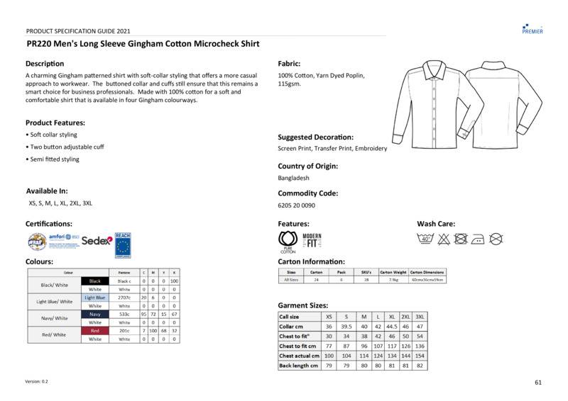 A welcome addition to the existing range of men’s shirts from Premier, this style reflects the latest corporate styles worn on the office floor. The Gingham print, along with soft collar styling offers a more casual approach to workwear, but the buttoned collar and cuffs ensure that this is still a smart choice for business professionals. Made with 100% cotton for a soft and comfortable shirt that is available in four popular colourways.Long sleeve fitted shirt with soft collar stylingDouble buttoned cuffsGingham patternBack yokeWRAP certifiedBSCI certifiedReach certifiedSEDEX certified.Accreditations: Amfori BSCI|Sedex|WRAP|ReachAge Group: AdultFabric: 100% Cotton, yarn-dyed poplinGender: MalePlus Size: YesProduct Type: ShirtsSize Range: XS to 3XLSizing To Fit: XS 30″ S 34″ M 38″ L 42″ XL 46″ 2XL 50″ 3XL 54″Tag: Sewn TagWashing Instructions: Domestic wash 40°c.Weight (GSM): 115gsm]]>