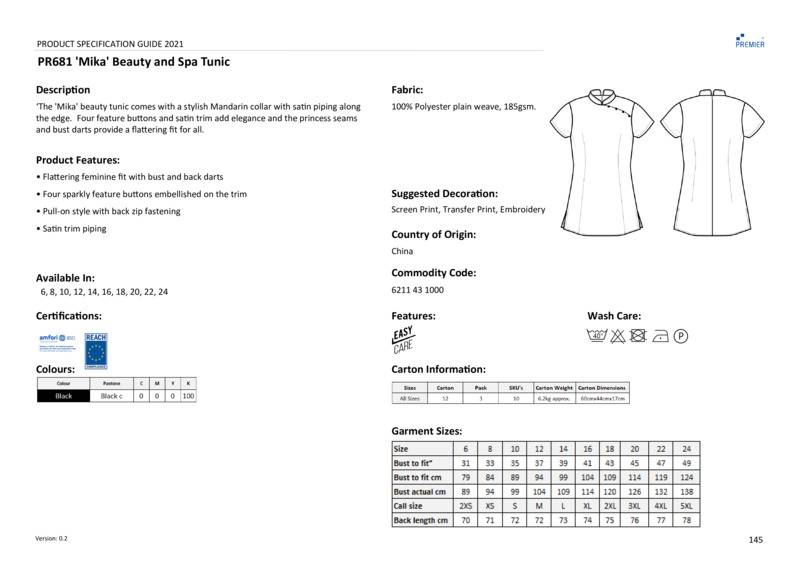 The 'Mika' beauty tunic comes with a stylish Mandarin collar with satin piping along the edge. Side yoke detail with four feature buttons and satin trim add elegance and the princess seams and bust darts provide a flattering fit for those working is salons and spas.Beauty and spa tunic with mandarin collarSide yoke detail with four feature buttons and satin trimPrincess seams and bust darts for flattering fitSide ventsBack zip fasteningSatin piping to collar edgeShort sleevesEasycareBSCI certifiedReach certified.Accreditations: Amfori BSCI|ReachAge Group: AdultFabric: 100% Polyester plain weaveGender: FemalePlus Size: YesProduct Type: TunicsSize Range: 6 to 24Sizing To Fit: 6 XXS 8 XS 10 S 12 M 14 L 16 XL 18 2XL 20 3XL 22 4XL 24 5XLTag: Sewn TagWashing Instructions: Domestic wash at 40c.Weight (GSM): 185gsm]]>