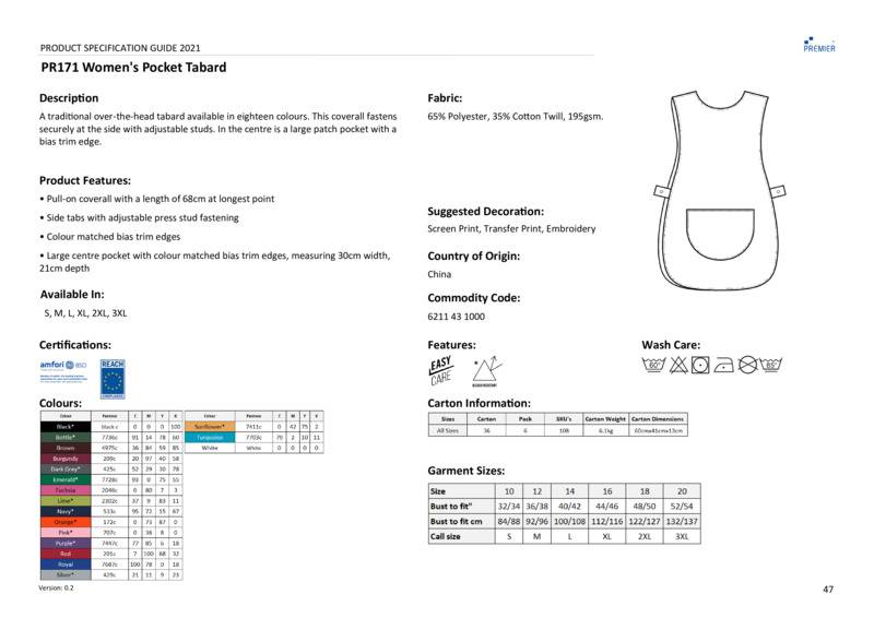 A traditional over-the-head tabard available in 18 vibrant colours. This coverall fastens securely at the side with adjustable studs and offers great protection against spillages. In the centre is a large patch pocket with a bias trim edge, useful for carrying accessories.Side tabs with adjustable, stud-fastened closuresColour-matched bias trim edges, large patch pocketCrease resistant finishIndustrial laundry 85°C, domestic wash 60°CBSCI certifiedReach certified.Accreditations: Amfori BSCI|ReachAge Group: AdultBag Dimensions: Approx length 68cmFabric: 65% Polyester, 35% Cotton twillGender: UnisexPlus Size: YesProduct Type: TabardsSize Range: S to 3XLSizing To Fit: S 10 M 12 L 14 XL 16 2XL 18 3XL 20Tag: Sewn TagWashing Instructions: Industrial laundering at 85c. Domestic wash at 60cWeight (GSM): 195gsm]]>
