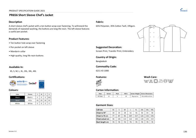 A very popular style seen in commercial kitchens, this short sleeve chef's jacket features a ten button wrap over fastening. To withstand the demands of repeated washing, the buttons are long life resin buttons. A very smart jacket for chef with a mandarin collar for a streamlined look. The left sleeve features a useful pen pocket.Short sleeves with ten button hole wrapover fasteningHigh quality, long-life, resin buttonsLeft sleeve pen pocketUnisex sizingThis chef’s jacket has a wrap over fastening, so it can be buttoned left or right as per individual preferenceWRAP certifiedOeko-Tex certifiedBSCI certifiedReach certifiedSEDEX certified.Accreditations: Amfori BSCI|Oeko-Tex|Sedex|WRAP|ReachAge Group: AdultFabric: 65% Polyester, 35% Cotton twillGender: MalePlus Size: YesProduct Type: Chef JacketsSize Range: XS to 4XLSizing To Fit: XS 30″ S 34″ M 38″ L 42″ XL 46″ 2XL 50″ 3XL 54″ 4XL 58″Tag: Sewn TagWashing Instructions: Industrial laundering at 85c. Domestic wash at 60cWeight (GSM): 195gsm]]>