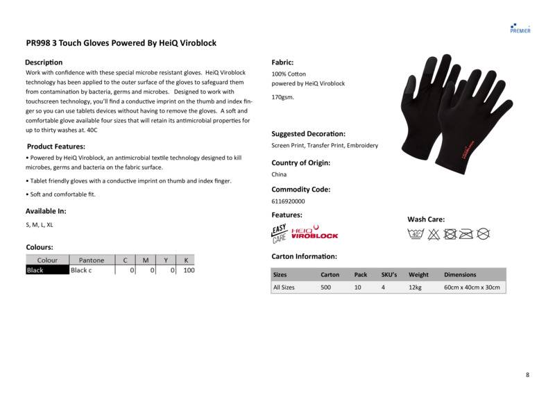 Work with confidence with these special microbe resistant gloves. HeiQ Viroblock technology has been applied to the outer surface of the gloves to safeguard them from contamination by bacteria, germs and microbes. Designed to work with touchscreen technology, you’ll find a conductive imprint on the thumb and index finger so you can use tablets devices without having to remove the gloves. A soft and comfortable glove available four sizes that will retain its antimicrobial properties for up to thirty washes at 40C.Powered by HeiQ Viroblock, an antimicrobial textile technologyTablet friendly gloves with a conductive imprint on thumb and index fingerSoft and comfortable cotton glovesTreated with a biocide: silver choloride.Age Group: AdultFabric: 95% Cotton, 5% Elastane powered by HeiQ ViroblockGender: UnisexPlus Size: NoProduct Type: GlovesSize Range: S to XLSizing To Fit: S M L XLTag: Sewn TagWashing Instructions: Wash at 40 degreesWeight (GSM): 170gsm]]>