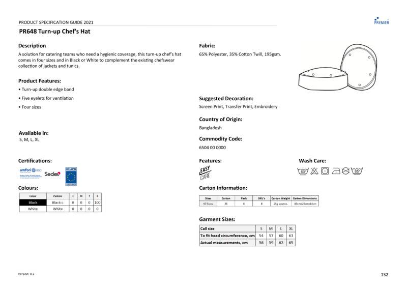 A solution for catering teams who need a level of headwear coverage, this turn-up chef’s hat comes in four sizes and in Black or White to complement the existing Chefswear collection of jackets and tunics. An elasticated back makes for an easy fitting flat cap for staff working in hygiene sensitive environments.Double band edgeFive eyelets for ventilation4 sizes availableBSCI certifiedReach certifiedSEDEX certified.Accreditations: Amfori BSCI|Sedex|ReachAge Group: AdultFabric: 65% Polyester, 35% CottonGender: UnisexPlus Size: NoProduct Type: HatsSize Range: S to XLSizing To Fit: S 54cm M 57cm L 60cm XL 63cmTag: Sewn TagWashing Instructions: Domestic wash 60°c. Industrial laundry 85°c.Weight (GSM): 195gsm]]>