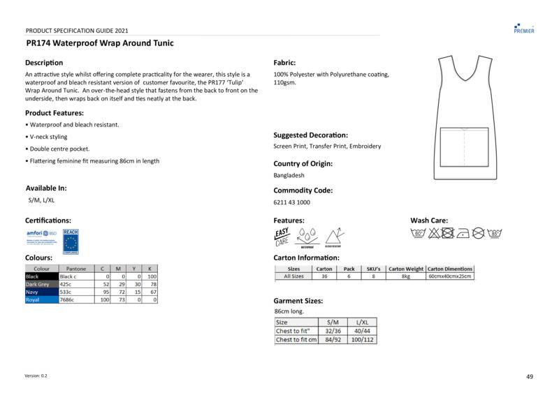 An attractive style whilst offering complete practicality for the wearer, this style is a waterproof and bleach resistant version of customer favourite, the PR177 ‘Tulip’ Wrap Around Tunic. An over-the-head style that fastens from the back to front on the underside, then wraps back on itself and ties neatly at the back. Waterproof and bleach resistantRound neckDouble centre pocketFlattering feminine fit measuring 86cm in lengthBSCI certifiedReach certified.Accreditations: Amfori BSCI|ReachAge Group: AdultFabric: 100% Polyester with polyurethane coatingGender: FemalePlus Size: NoProduct Type: TunicsSize Range: S/M to L/XLSizing To Fit: S/M 32/36″ L/XL 40/44″Tag: Sewn TagWashing Instructions: Domestic wash 60C. Industrial wash 85C.Weight (GSM): 110gsm]]>