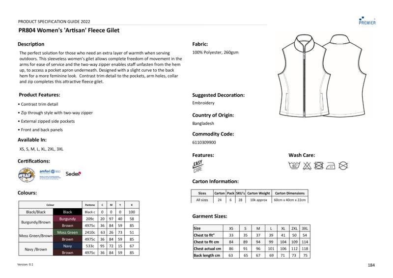The perfect solution for those who need an extra layer of warmth when serving outdoors. This sleeveless women’s gilet allows complete freedom of movement in the arms for ease of service, and the two-way zipper enables staff to unfasten from the hem up, to access a pocket apron underneath. Designed with a slight curve to the back hem for a more feminine look. Contrast trim detail to the pockets, arm holes, collar and zip completes this attractive fleece gilet.Sleeveless gilet with contrast trim detailHigh-neck rounded collar, leading into a two-way zipperTwo zipped external pockets and two internal open pocketsFront panel detail and curve to the back hemContrast fabric hook on back of collar for hanging upWRAP certifiedSEDEX certifiedBSCI certified.Accreditations: Amfori BSCI|Sedex|WRAPAge Group: AdultFabric: 100% PolyesterGender: FemalePlus Size: YesProduct Type: FleeceSize Range: XS to 3XLSizing To Fit: XS 8 S 10 M 12 L 14 XL 16 2XL 18 3XL 20Tag: Sewn TagWeight (GSM): 260gsm]]>