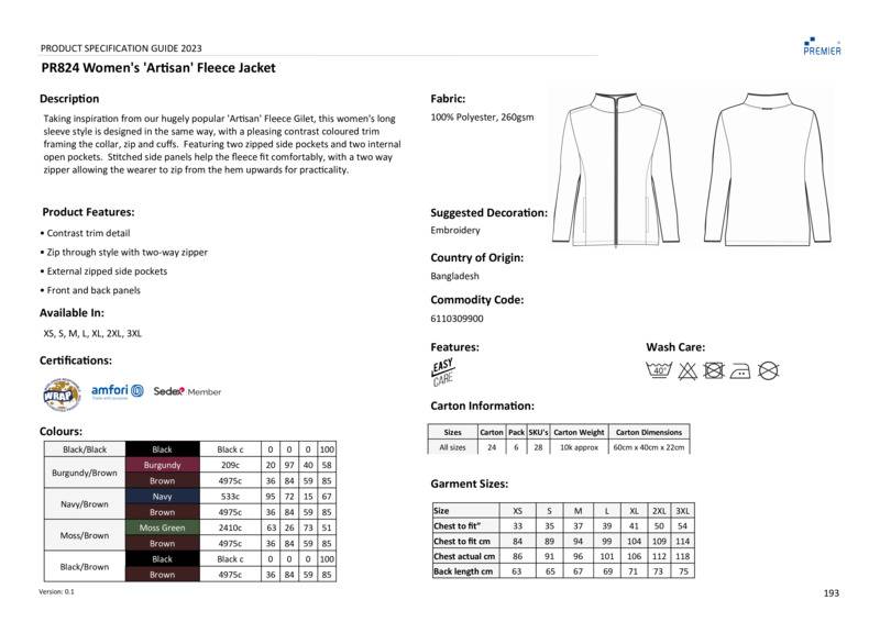 Taking inspiration from the hugely popular ‘Artisan’ fleece gilet, this women’s long sleeve jacket is designed in the same way, with a pleasing contrast coloured trim framing the collar, zip and cuffs. Features two zipped side pockets and two internal open pockets. Stitched side panels help the fleece fit comfortably, with a two-way zip allowing the wearer to zip from the hem upwards, for practicality. A welcome outerwear addition to Premier’s ‘Artisan’ range.Women’s long sleeve fleece jacket with contrast trim detail High neck rounded collar, leading into a two-way zipperTwo zipped external pockets and two internal open pocketsStitched side panel detailElasticated cuff with trim detailContrast fabric hook on back of collar for hanging upCertified WRAP, Amfori BSCI and Sedex.Accreditations: Amfori BSCI|WRAP|SedexAge Group: AdultFabric: 100% PolyesterGender: FemalePlus Size: YesProduct Type: FleeceSize Range: XS – 3XLSizing To Fit: XS 33″ S 35″ M 37″ L 39″ XL 41″ 2XL 43″ 3XL 45″Tag: Tear-outWashing Instructions: Wash at 40?CWeight (GSM): 260gsm]]>