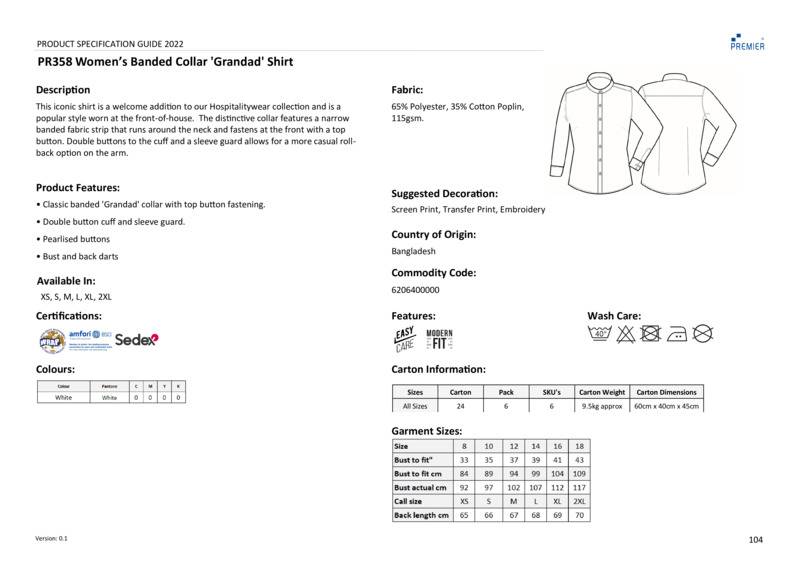 This iconic shirt is a welcome addition to our hospitalitywear collection and is a popular style for wearing front-of-house. The distinctive collar features a narrow banded fabric strip that runs around the neck and fastens at the front with a top button. Double buttons to the cuff and a sleeve guard allow for a more casual rollback option on the arm. Styled with bust and back darts and a curved hem for a flattering feminine fit.Classic banded ‘Grandad’ collar with top button fasteningDouble-button cuff and sleeve guardBust, back darts and a curved hemPearlised buttonsBSCI certifiedSEDEX certifiedWRAP certified.Accreditations: WRAP|Amfori BSCI|SedexAge Group: AdultFabric: 65% Polyester, 35% CottonGender: FemalePlus Size: NoProduct Type: ShirtsSize Range: XS to 2XLSizing To Fit: XS 33″ S 35″ M 37″ L 39″ XL 41″ 2XL 43″Tag: Sewn TagWashing Instructions: 40°CWeight (GSM): 115gsm]]>