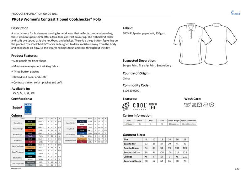 A smart choice for businesses looking for workwear that reflects company branding, these polo shirts offer a two-tone contrast colouring. The ribbed knit collar and cuffs is colour tipped as is the neckband and placket. There is a three button fastening on the placket for a casual unbuttoned look or smart fastened up style. The Coolchecker fabric is designed to draw moisture away from the body and encourage air flow, so the wearer remains fresh and cool throughout the day. Side panels create an aesthetically pleasing fitted style for women.Contrast tipped details on collar, placket, arm cuffs and side ventsSide panels for a fitted shapeBust and back dartsThree button placketReach certifiedSEDEX certified.Accreditations: Sedex|ReachAge Group: AdultFabric: 100% PolyesterGender: FemalePlus Size: NoProduct Type: PolosSize Range: XS to 2XLSizing To Fit: XS 8 S 10 M 12 L 14 XL 16 2XL 18Tag: Sewn TagWashing Instructions: Domestic wash 40°c.Weight (GSM): 155gsm]]>