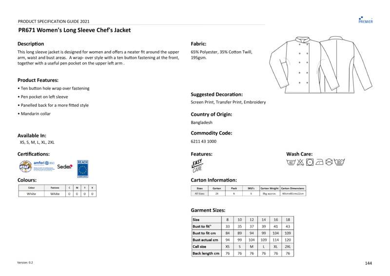 A chef's jacket designed for women with a fitted styling around the upper arm, waist and bust areas. The left arm has a useful pen pocket. Fastened with white buttons in a wrap over style, this jacket is a welcome addition to the Premier range.Women's fitted chefs jacketLong sleeved10 button hole wrap-over fasteningPanelled back for more fitted styleLeft sleeve pen pocketMandarin collarMade from OEKO-TEX Standard 100WRAP certifiedOeko-Tex certifiedBSCI certifiedReach certifiedSEDEX certified.Accreditations: Amfori BSCI|Oeko-Tex|Sedex|WRAP|ReachAge Group: AdultFabric: 65% Polyester, 35% CottonGender: FemalePlus Size: NoProduct Type: Chef JacketsSize Range: XS to 2XLSizing To Fit: XS 8 S 10 M 12 L 14 XL 16 2XL 18Tag: Sewn TagWashing Instructions: Industrial laundering at 85°c.Weight (GSM): 195gsm]]>