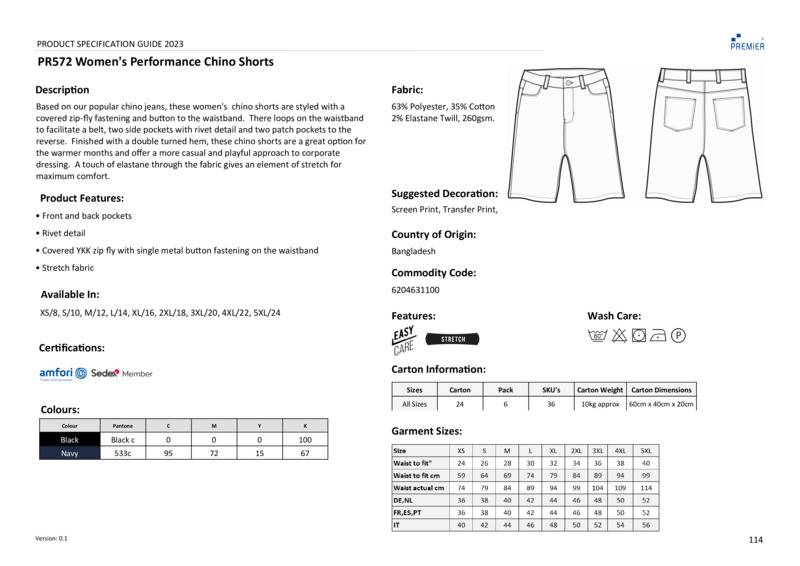 Based on the popular chino jeans, these women’s chino shorts are styled with a covered zip fly fastening and button to the waistband. There are loops on the waistband to facilitate a belt, two side pockets with rivet detail and two patch pockets to the reverse. Finished with a double turned hem, they are a great option for the warmer months and offer a more casual and playful approach to corporate dressing. A touch of elastane through the fabric provides an element of stretch for maximum comfort.Women’s chino shorts with a touch of elastane for comfortable stretch performanceTo the waistband there are loops to facilitate a belt, a metal button and a hook and bar for secure fasteningCovered YKK zip fly and side pockets with rivet detail for a typical ‘chino’ lookTwo patch pockets to the reverseFinished with a double turned hemCertified amfori BSCI and Sedex.Accreditations: Sedex|Amfori BSCIAge Group: AdultFabric: 63% Polyester, 35% Cotton, 2% ElastaneGender: FemalePlus Size: YesProduct Type: ShortsSize Range: XS – 5XLSizing To Fit: XS 8 S 10 M 12 L 14 XL 16 2XL 18 3XL 20 4XL 22 5XL 24Tag: Tear-outWashing Instructions: Wash at 60?CWeight (GSM): 260gsm]]>