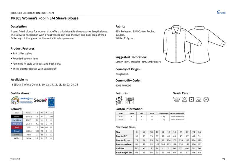 A semi fitted blouse for women that offers the wearer a fashionable three-quarter length sleeve. The sleeve is finished off with a neat vented cuff and the bust and back area offers a flattering cuts that gives the blouse its fitted appearance.Soft collar styling, rounded bottom hemFitted styling with bust darts and back dartsEasy-care fabricPearlised buttons on light blue and whiteSelf coloured buttons on remaining coloursWRAP certifiedBSCI certifiedReach certifiedSEDEX certified.Accreditations: Amfori BSCI|Sedex|WRAP|ReachAge Group: AdultFabric: 65% Polyester, 35% Cotton, plain poplinGender: FemalePlus Size: YesProduct Type: BlousesSize Exclusions: *6 only available in these coloursSize Range: 6 to 26Sizing To Fit: 6* XXS 8 XS 10 S 12 M 14 L 16 XL 18 2XL 20 3XL 22 4XL 24 5XL 26 6XLTag: Sewn TagWashing Instructions: Domestic wash at 40c. Wash dark colours separately. Wash inside outWeight (GSM): 105gsm. White 115gsm]]>
