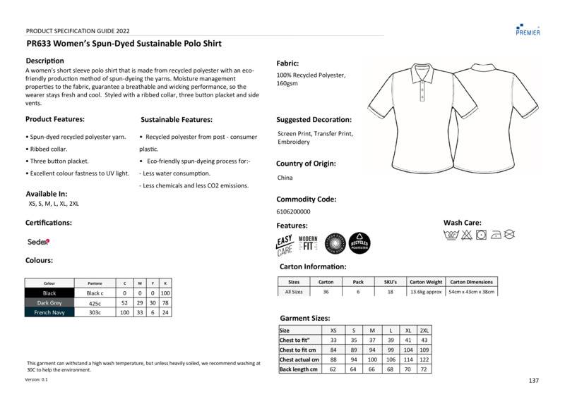 Women’s short sleeve polo shirt made from recycled polyester with an eco-friendly production method for creating spun dyed yarns. Moisture management properties to the fabric guarantee a breathable and wicking performance, so the wearer stays fresh and cool. Styled with a ribbed collar, three-button placket and side vents.Made with spun dyed recycled polyester yarnRibbed collarThree-button placketMoisture management fabric propertiesSide ventsSEDEX certified.Accreditations: SedexAge Group: AdultFabric: 100% Recycled polyesterGender: FemalePlus Size: NoProduct Type: PolosSize Range: XS to 2XLSizing To Fit: XS 33″ S 35″ M 37″ L 39″ XL 41″ 2XL 43″Tag: Sewn TagWashing Instructions: 60°CWeight (GSM): 160gsm]]>