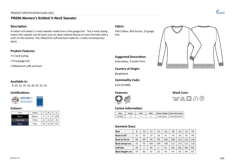 A ladies V neck jumper made from a fine gauge knitted cotton rich yarn. The V-neck styling means this ladies sweater can be worn over a blouse with a scarf on the neckline. The sleeves and hem are set in making for a really contemporary piece that is perfect for professional office environments.Women's long sleeve v-neck jumperSoft feel/cotton rich yarnFine gauge knitContemporary stylingSet in sleevesWRAP certifiedBSCI certifiedReach certified.Accreditations: Amfori BSCI|WRAP|ReachAge Group: AdultFabric: 55% Cotton, 45% AcrylicGender: FemalePlus Size: YesProduct Type: Knitted JumpersSize Range: 8 to 24Sizing To Fit: 8 XS 10 S 12 M 14 L 16 XL 18 2XL 20 3XL 22 4XL 24 5XLTag: Sewn TagWashing Instructions: Domestic wash at 40cWeight (GSM): 12 Gauge]]>