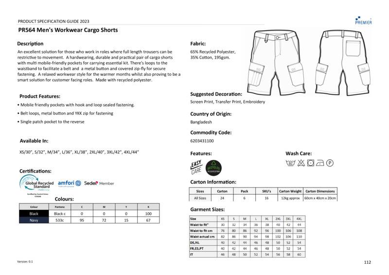 An excellent solution for those who work in roles where full-length trousers can be restrictive to movement. A hardwearing, durable and practical pair of cargo shorts with multi mobile-friendly pockets for carrying essential kit. There's loops to the waistband to facilitate a belt and a metal button and covered zip-fly for secure fastening. A relaxed workwear style for the warmer months whilst also proving to be a smart solution for customer facing roles. A highly versatile pair of men's cargo shorts that are washable to 60C.Hard-wearing, durable workwear shorts for menBelt loops and metal button to the waistband and covered YKK zip for secure fasteningThe left belt loop has a plastic triangle ring for affixing toolsTwo open side pocketsThe upper left leg carries a mobile-friendly hook and loop flap-sealed pocket with combined pen slot, while the right leg also features a handy flap-sealed pocketSingle patch pocket to the reverseCertified amfori BSCI and Sedex.Accreditations: Sedex|Amfori BSCIAge Group: AdultFabric: 63% Recycled polyester, 35% CottonGender: MalePlus Size: YesProduct Type: ShortsSize Range: XS – 4XLSizing To Fit: XS 30″ S 32″ M 34″ L 36″ XL 38″ 2XL 40″ 3XL 42″ 4XL 44″Tag: Tear-outWashing Instructions: Wash at 60?CWeight (GSM): 195gsm]]>