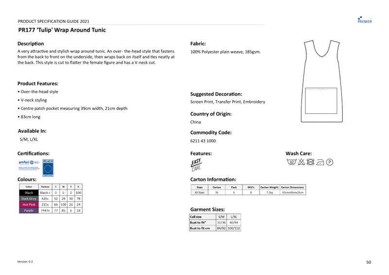 A very attractive and stylish wrap around tunic that offers businesses an alternative solution to traditional tabards and tunics. An over the head style that fastens from the back to front on the underside, then wraps back on itself and ties neatly at the back. This style is cut to flatter the female figure and features a v –neck and side vents which allow complete ease of movement.Over the head wrap around tunic, Fastens from front to back with self-fabric tiesDouble front pocketV-neck stylingLength of 83cmBSCI certifiedReach certified.Accreditations: Amfori BSCI|ReachAge Group: AdultFabric: 100% Polyester plain weaveGender: FemalePlus Size: NoProduct Type: TunicsSize Range: S/M to L/XLSizing To Fit: S/M 10/12 L/XL 14/16Tag: Sewn TagWashing Instructions: Domestic wash 40°c.Weight (GSM): 185gsm]]>