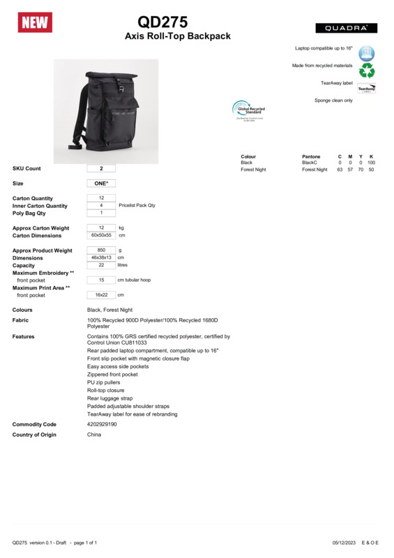 Contains 100% GRS certified recycled polyester, certified by Control Union CU811033Rear padded laptop compartment, compatible up to 16″Front slip pocket with magnetic closure flapEasy-access side pocketsZipped front pocketPU zip pullsRoll-top closureRear luggage strapPadded, adjustable shoulder strapsTearAway label for ease of rebranding.Accreditations: Global Recycled StandardAge Group: AdultBag Capacity: 22 litresBag Dimensions: 46 x 38 x 13cmFabric: 100% Recycled 900D polyester. 100% Recycled 1680D polyesterGender: UnisexPlus Size: NoProduct Type: BagsSize Range: One sizeSizing To Fit: One sizeTag: Tear-awayWashing Instructions: Sponge clean only.Weight (GSM): 850g]]>