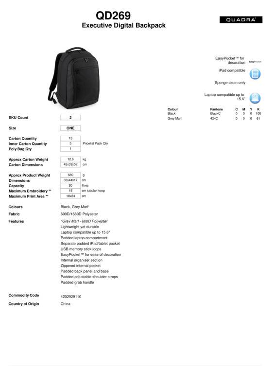 EasyPocket™ for ease of decorationLightweight yet durableLaptop compatible up to 15.6″Padded laptop compartmentSeparate padded iPad/Tablet pocketZippered internal pocketInternal organiser sectionUSB memory stick loopsPadded adjustable shoulder strapsPadded back panelPadded basePadded grab handleReach certified.Accreditations: ReachAge Group: AdultBag Capacity: 20 LitresBag Dimensions: 33 x 44 x 17cmEmbroidery Information: 15 Tubular hoopFabric: 600D/1680D Polyester combination. Grey Marl: 600D PolyesterGender: UnisexPlus Size: NoPrint Area: 18 x 24cmProduct Type: BagsSize Range: OnesizeSizing To Fit: One sizeTag: Sewn TagWashing Instructions: Sponge clean only.Weight (GSM): 680g]]>