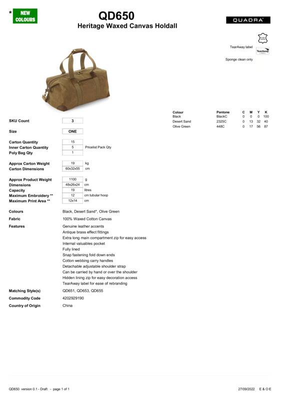 The Heritage waxed canvas holdall is British on aesthetics and versatile by design. With traditional genuine leather accents and a concealed lining zip to allow easy decoration, this luxe edition is the ultimate weekender bag.TearAway label for ease of rebrandingGenuine leather accentsExtra long main compartment zip for easy accessSnap fastening fold down endsCotton webbing carry handlesAntique brass effect fittingsFully linedHidden lining zip for easy decoration accessInternal valuables pocketDetachable adjustable shoulder strapCan be carried by hand or over the shoulderBSCI certifiedReach certified.Accreditations: Amfori BSCI|ReachAge Group: AdultBag Capacity: 19 LitresBag Dimensions: 26 x 48 x 24cmEmbroidery Information: 12 Tubular hoopFabric: 100% Waxed cotton canvasGender: UnisexPlus Size: NoPrint Area: 12 x 14cmProduct Type: BagsSize Range: OnesizeSizing To Fit: One sizeTag: Tear-outWashing Instructions: Sponge clean only.Weight (GSM): 1100g]]>