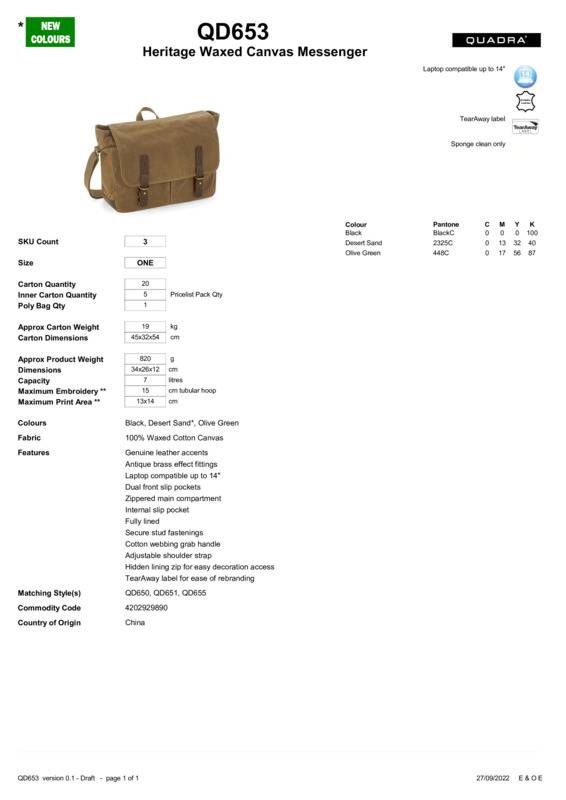 Discover premium fabrics and handcrafted details with the Heritage waxed canvas messenger. Available in a luxe waxed cotton canvas with authentic leather accents and antique brass effect fittings, this casual carryall makes the perfect statement piece.TearAway label for ease of rebrandingGenuine leather accentsZippered main compartment.Dual front slip pocketsSecure stud fasteningsAntique brass effect fittingsFully linedInternal slip pocketLaptop compatible up to 14″Cotton webbing grab handleAdjustable shoulder strapBSCI certifiedReach certified.Accreditations: Amfori BSCI|ReachAge Group: AdultBag Capacity: 7 LitresBag Dimensions: 28 x 34 x 12cmEmbroidery Information: 15 Tubular hoopFabric: 100% Waxed cotton canvasGender: UnisexPlus Size: NoPrint Area: 13 x 14cmProduct Type: BagsSize Range: OnesizeSizing To Fit: One sizeTag: Tear-outWashing Instructions: Sponge clean only.Weight (GSM): 820g]]>
