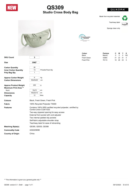 Control Union CU811033Two-way zipped opening for easy accessExternal front pocket with cord adjusterTwo internal padded slip pocketsSelf-fabric adjustable shoulder strapTearAway label for ease of rebranding.Accreditations: Global Recycled StandardAge Group: AdultBag Capacity: 12 litresBag Dimensions: 45 x 22 x 12cmFabric: 100% Recycled polyester T400DGender: UnisexPlus Size: NoProduct Type: BagsSize Range: One sizeSizing To Fit: One sizeTag: Tear-awayWashing Instructions: Sponge clean only.Weight (GSM): 200g]]>