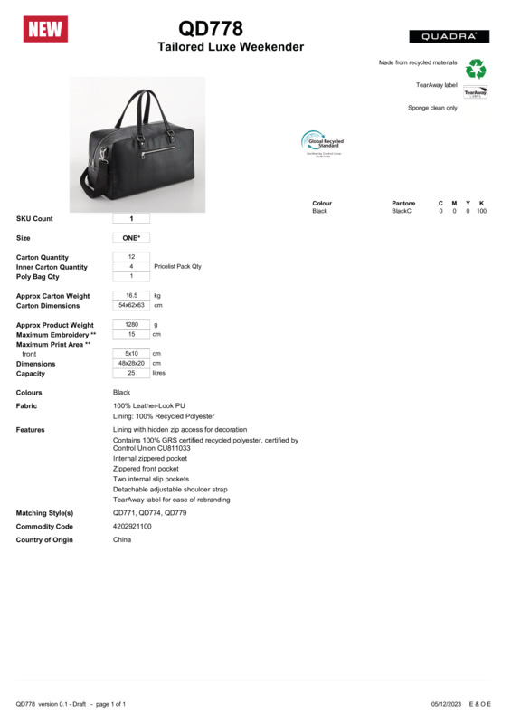 Contains 100% GRS certified recycled polyester, certified by Control Union CU811033Internal zipped pocketZipped front pocketTwo internal slip pocketsDetachable, adjustable shoulder strapTearAway label for ease of rebranding.Accreditations: Global Recycled StandardAge Group: AdultBag Capacity: 25 litresBag Dimensions: 48 x 28 x 20cmFabric: 100% Leather-look PU. Lining: 100% Recycled polyesterGender: UnisexPlus Size: NoProduct Type: BagsSize Range: One sizeSizing To Fit: One sizeTag: Tear-awayWashing Instructions: Sponge clean only.Weight (GSM): 1280g]]>