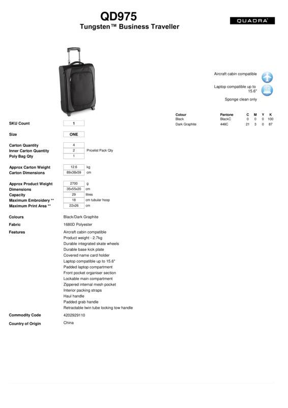 Aircraft cabin compatibleRetractable twin tube locking tow handleDurable integrated skate wheelsDurable base kick plateInterior packing strapsLaptop compatible up to 15.6″Padded laptop compartmentFront pocket organiser sectionCovered name card holderLockable main compartmentZippered internal mesh pocketHaul handlePadded grab handleReach certifiedSEDEX certified.Accreditations: Sedex|ReachAge Group: AdultBag Capacity: 29 LitresBag Dimensions: 38 x 55 x 20cmEmbroidery Information: 18 Tubular hoopFabric: 1680D PolyesterGender: UnisexPlus Size: NoPrint Area: 22 x 26cmProduct Type: BagsSize Range: OnesizeSizing To Fit: One sizeTag: Sewn TagWashing Instructions: Sponge clean onlyWeight (GSM): 2700g]]>