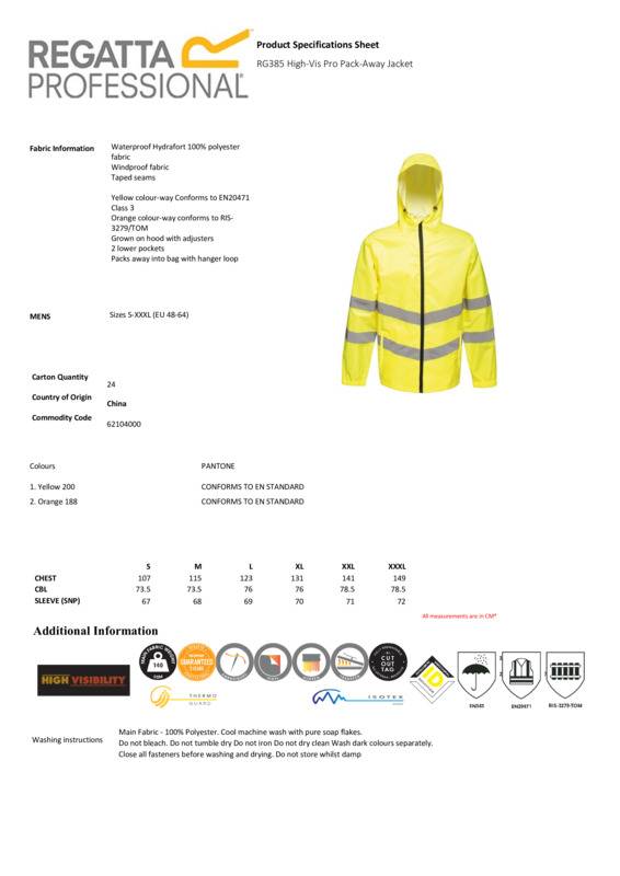 Pack this jacket away when travelling to and from the job. The lightweight high-vis jacket is waterproof and windproof, offering protection without the bulk.Fabric information - Waterproof and breathable Isotex 10000 100% polyester fabricWindproof fabricTaped seamsSpecial features - EN ISO 20471:2013 + A1:2016 Class 3Grown on hood with adjusters2 lower pocketsPacks away into a separate bag with hanger loopOrange colour-way also conforms to RIS-3279/TOM when worn with RIS-3279-TOM Class 2 upper body clothingID Reflection - angled chevrons allow people to know which way you are facing towards or away from them at a quick glance, increasing safety in low light This product has no external logo branding.Age Group: AdultFabric: Waterproof and breathable Isotex 10000 100% Polyester fabricGender: MalePlus Size: YesProduct Type: JacketsSize Range: S to 3XLSizing To Fit: S 37/38″ M 39/40″ L 41/42″ XL 43/44″ 2XL 46/48″ 3XL 49/51″Tag: Sewn TagWashing Instructions: Machine washable. Do not bleach. Do not tumble dryDo not iron Do not dry clean Do not use biologicaldetergents. Close all fasteners before washing anddrying. Do not store whilst dampWeight (GSM): 140gsm]]>